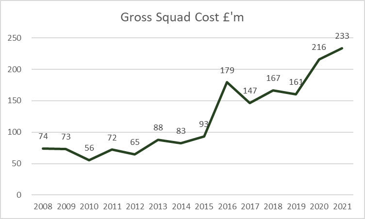 Gross squad cost at 30 June was £233m, less than a quarter of some other PL clubs.