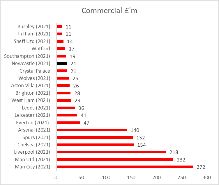 Newcastle commercial revenue down 29% and lower than the first season that the club had under MA. Covid had an impact, but not the only reason for the poor figures as less than 10% of commercial revenue of MUFC, MCFC and LFC #NUFC