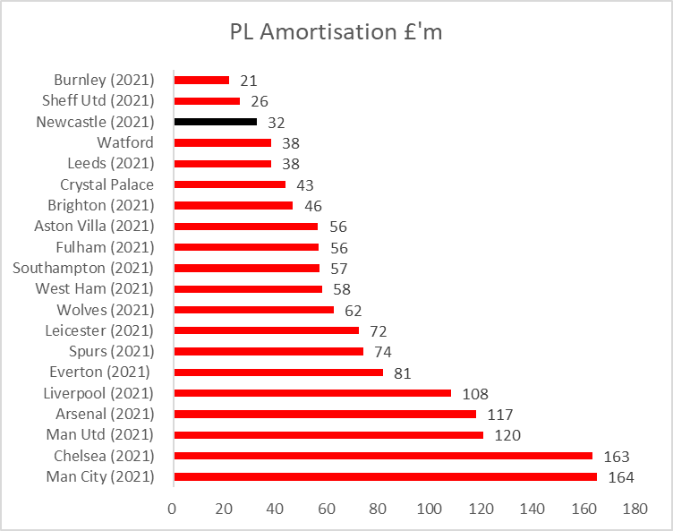Main costs for clubs are wages and amortisation. New owners have invested heavily in players and that comes with a 36% increase in wages to a record £136m. Still low by PL standards though. Amortisation (transfer fees spread over contract length) up by 49% as cost of staying in PL is not cheap.