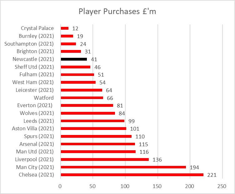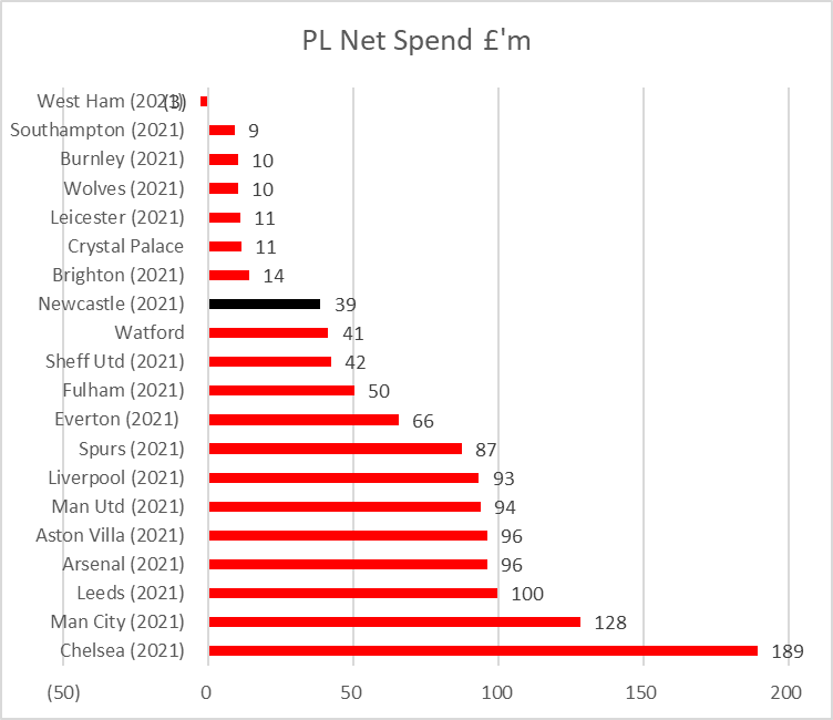 Newcastle bought players for £41m and had sales of £2m, giving an overall net spend under MA of £195m in 14 years.
