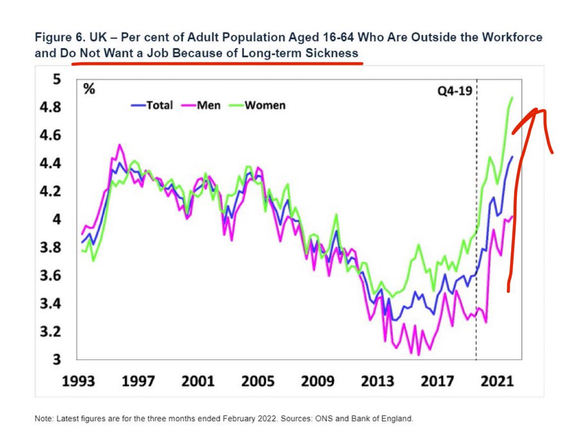 Whoa—@bankofengland just warned that deep concern of surging #LongCovid is taking workers out of the workforce. The spike ⬆️ in workers age 16-64 who do not work because of long term illness during the #COVID pandemic is alarming, and fast increasing. Mass infection depravity.🧵