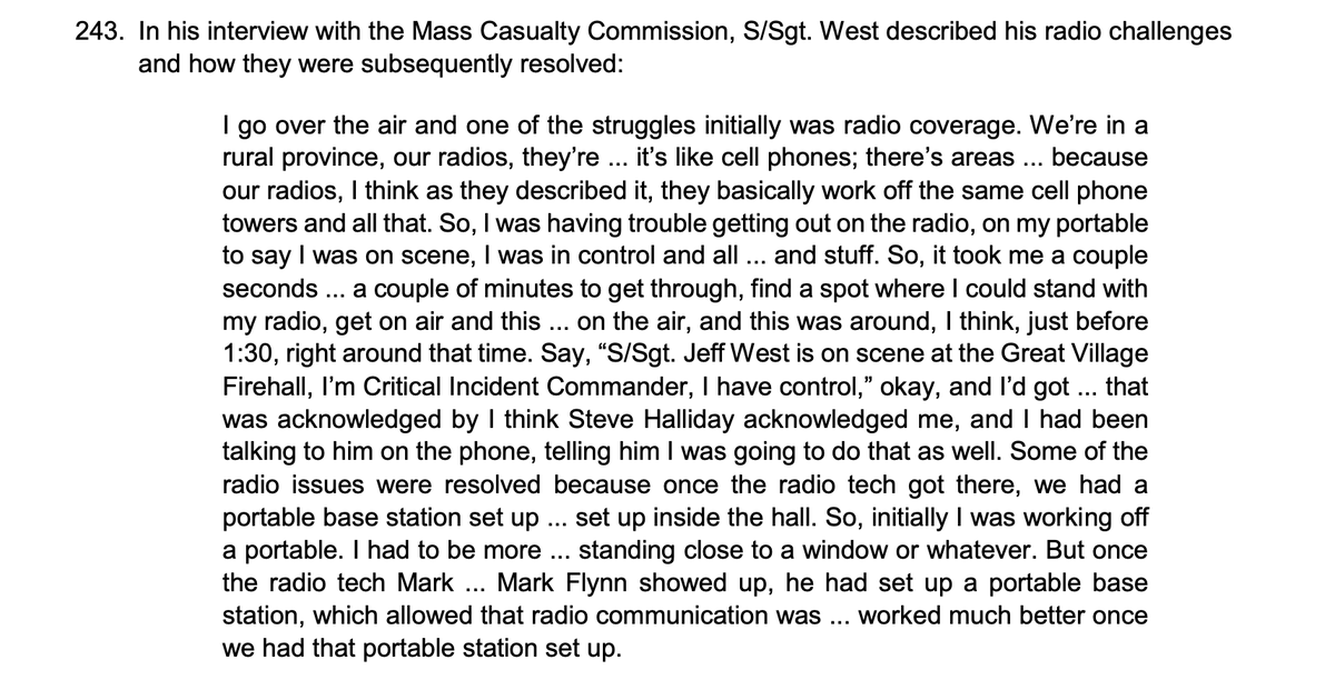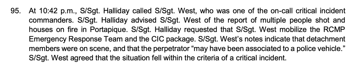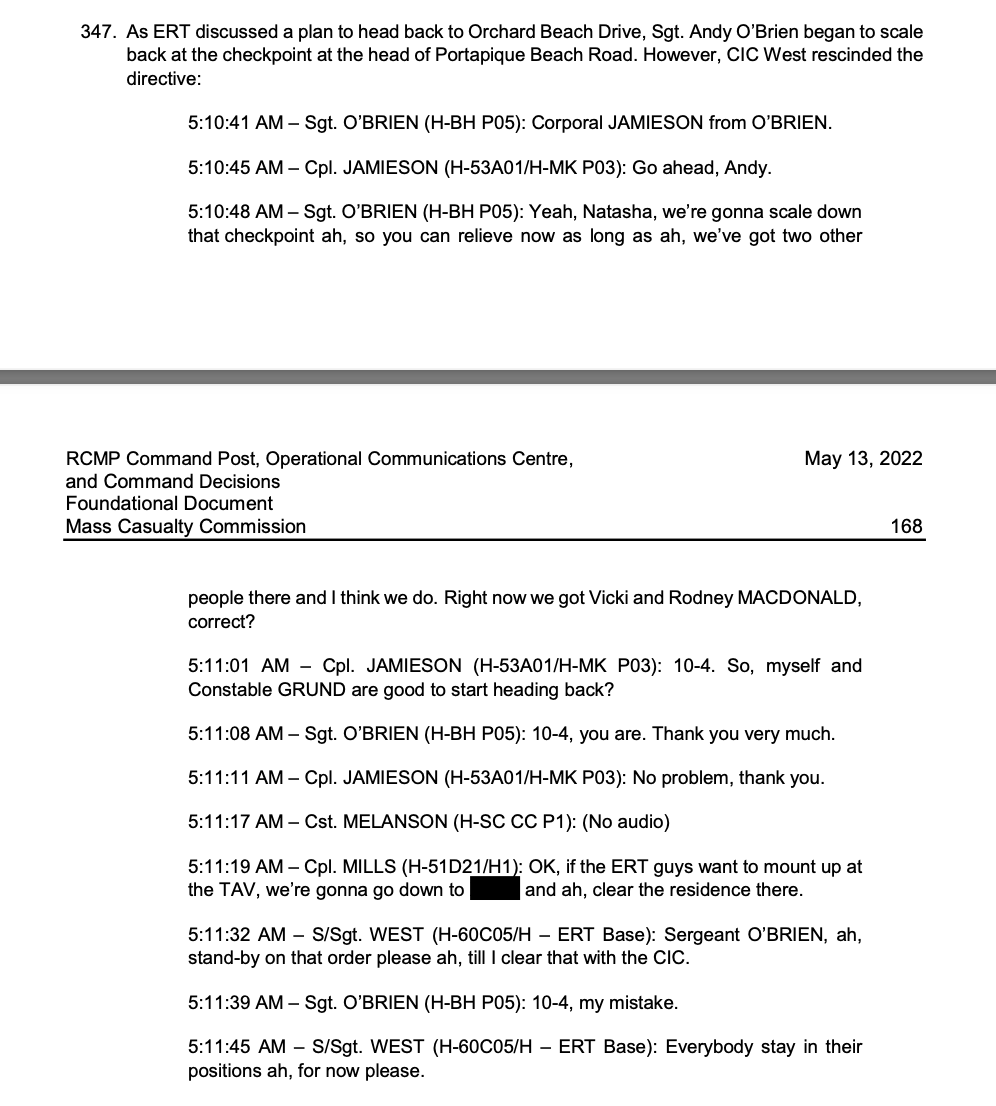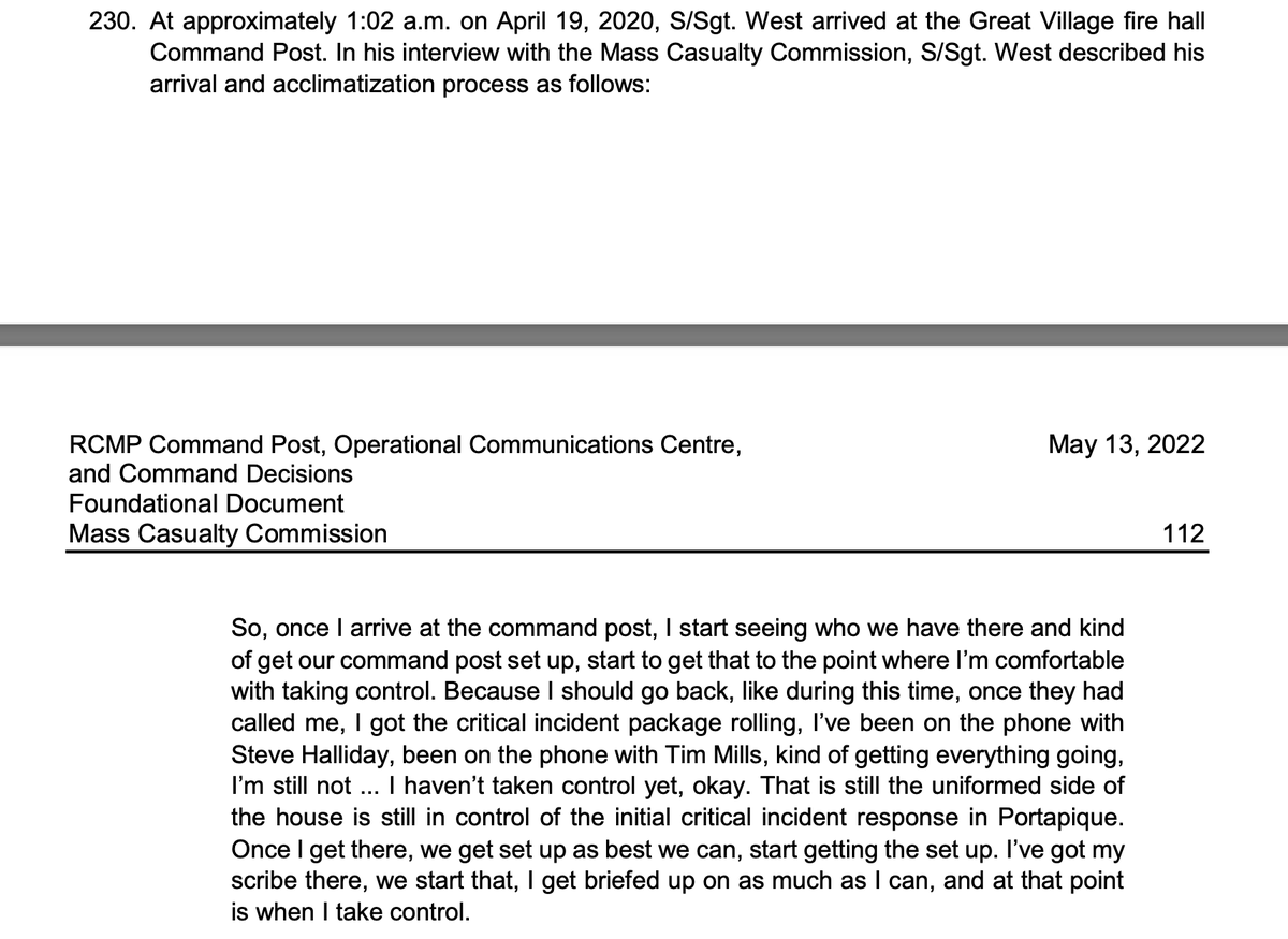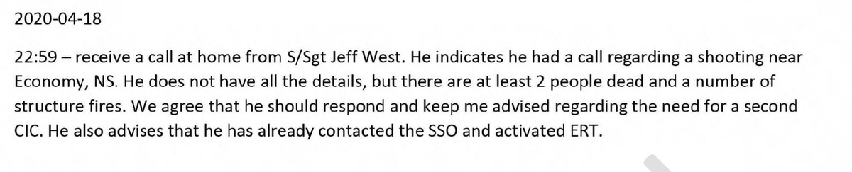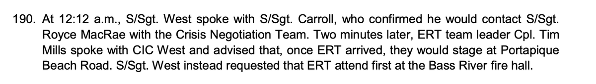 West called Tim Mills, the commander of the Emergency Response Team (ERT). West was at home in HRM, went to the RCMP headquarters in Dartmouth to "gear up" and obtain a "scribe" — the note taker for an incident #MCC