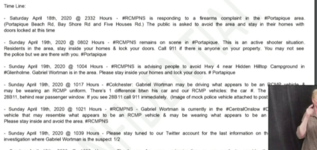 Bryson asks, if in hindsight, they are comfortable with how the public messaging happened. He then shows this timeline of @RCMPNS tweets #MCC