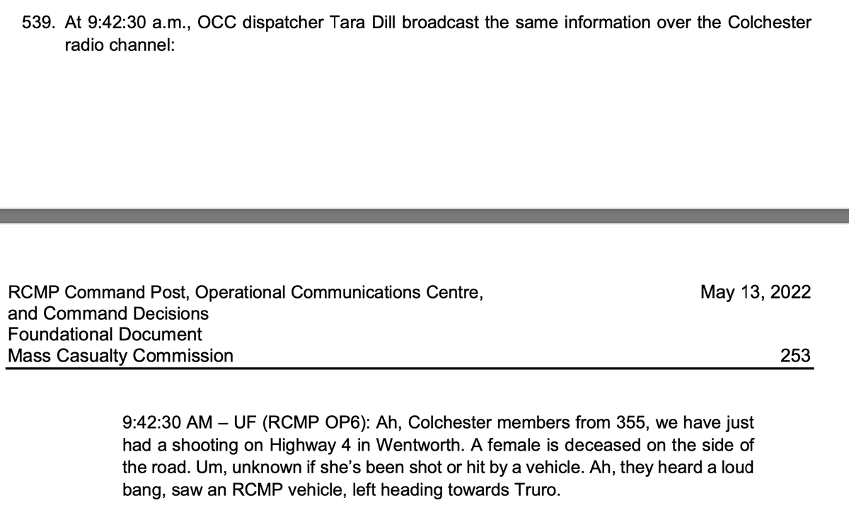 Miller shows this part of the doc, the point being that at 6:44 police were told that GW intended to head to Dartmouth, so why were checkpoints established around Truro. Surette says they had already got HRPD to check those residences #MCC