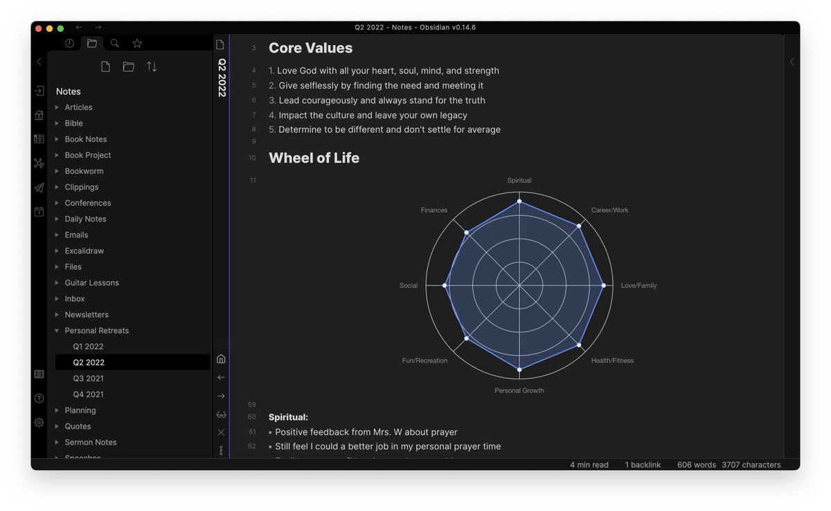 My quarterly personal retreats always bring a ton of clarity. I have a text-based template set up in Obsidian that facilitates my thinking time questions and the Charts View plugin lets me recreate my wheel of life.