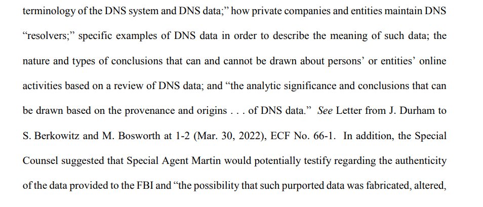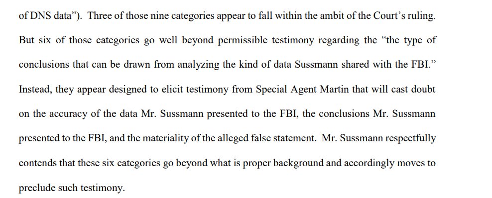 2/ Sussmann's complaint is that expert is going to far by actually explaining “the type of conclusions that can be drawn from analyzing the kind of data Sussmann shared with the FBI" w/ detail showing problems w/ DNS data b/c that calls into question the reports.