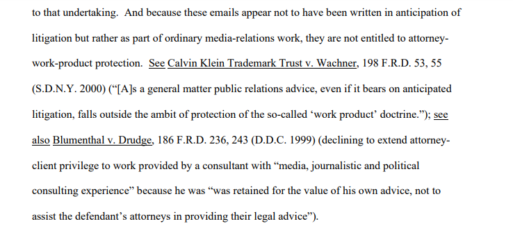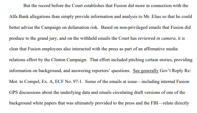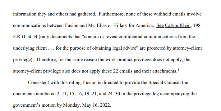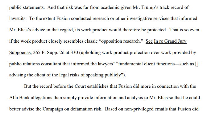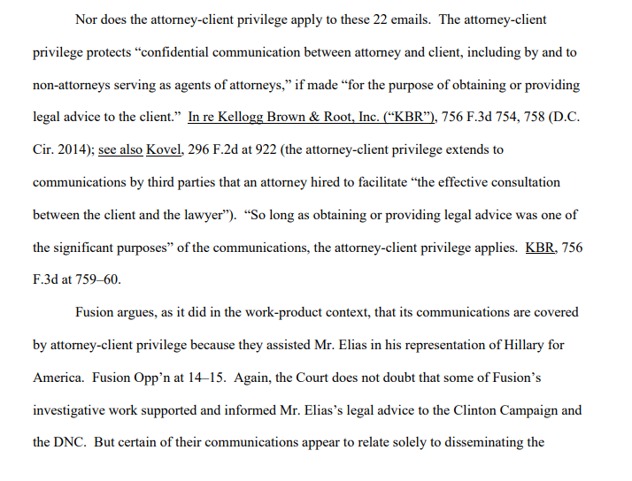 2/ Rather, Clinton Campaign hired Perkins Coie that hired Fusion GPS which employed Seago. Yet, court said Joffe's communications with Seago were protected b/c Joffe claimed communications at issue was to obtain [Fusion’s] assistance in cybersecurity and technical matters
