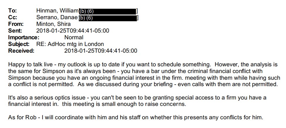 (2/5) In a terse exchange with an SEC ethics staffer on Jan 25, 2018, Hinman tries to get clearance to attend mtg. w/ Simpson Thacher in London. She warns him he can't have "any meetings" w/ the firm.