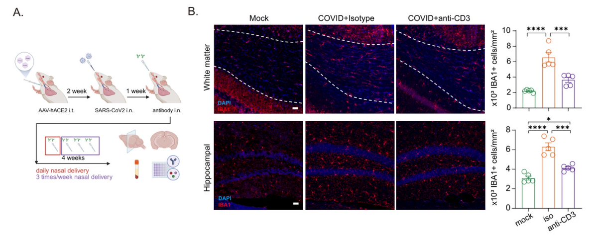 First, we tested whether anti-CD3 mAb administered nasally starting at 1 week post-infection for 4 weeks. The treatment restored microglial and astrocyte densities and reduced inflammatory cytokines.