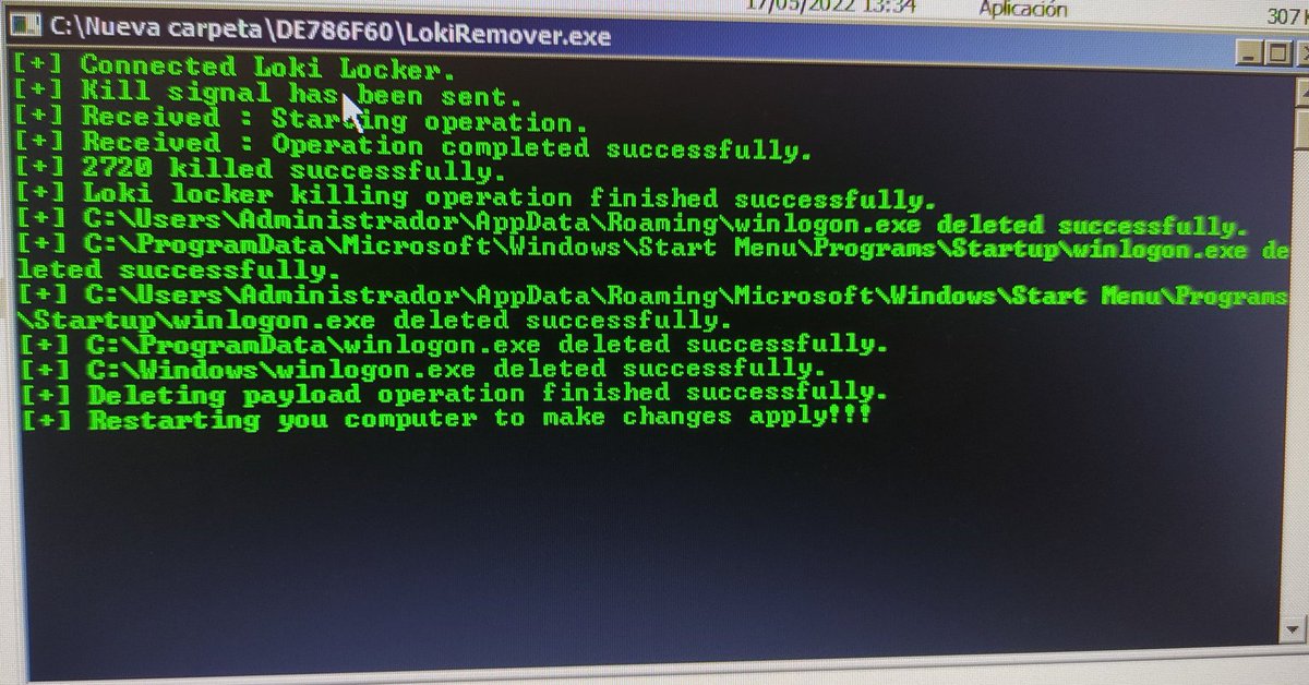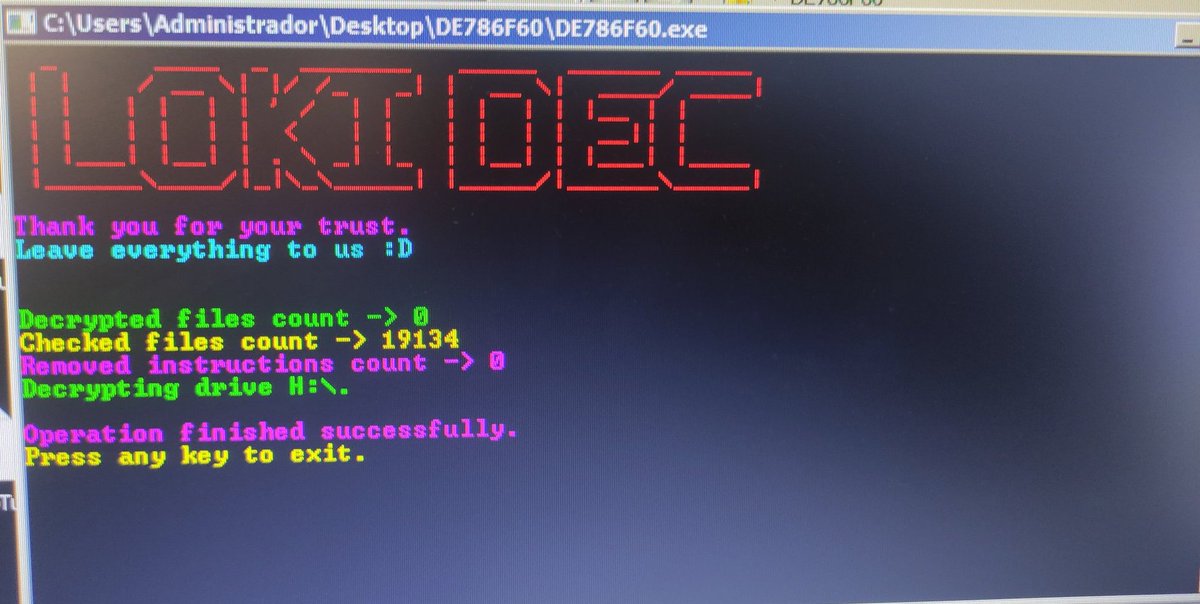 "El cliente ha decidido pagar y nos han enviado zip con dos archivos un eliminador de virus y el desencriptador. Ejecuto el paso a paso y le comunico que todo va bien. Reinicio el PC y Pumm se vuelve a encriptar todo. "