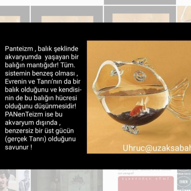 Düşünün , bir akvaryumdaki balıksın ve sadece bu akvaryuma , dokundugun suya, bedenine göre, evren hakkında kararlar veriyorsun . Bu akvaryumda doğdum , burada büyüyüp öleceğim diyip , tanrı burası olmalı demek gibi . Ya da ben bu akvaryumun tanrısıyım demek gibi ... ImageImage