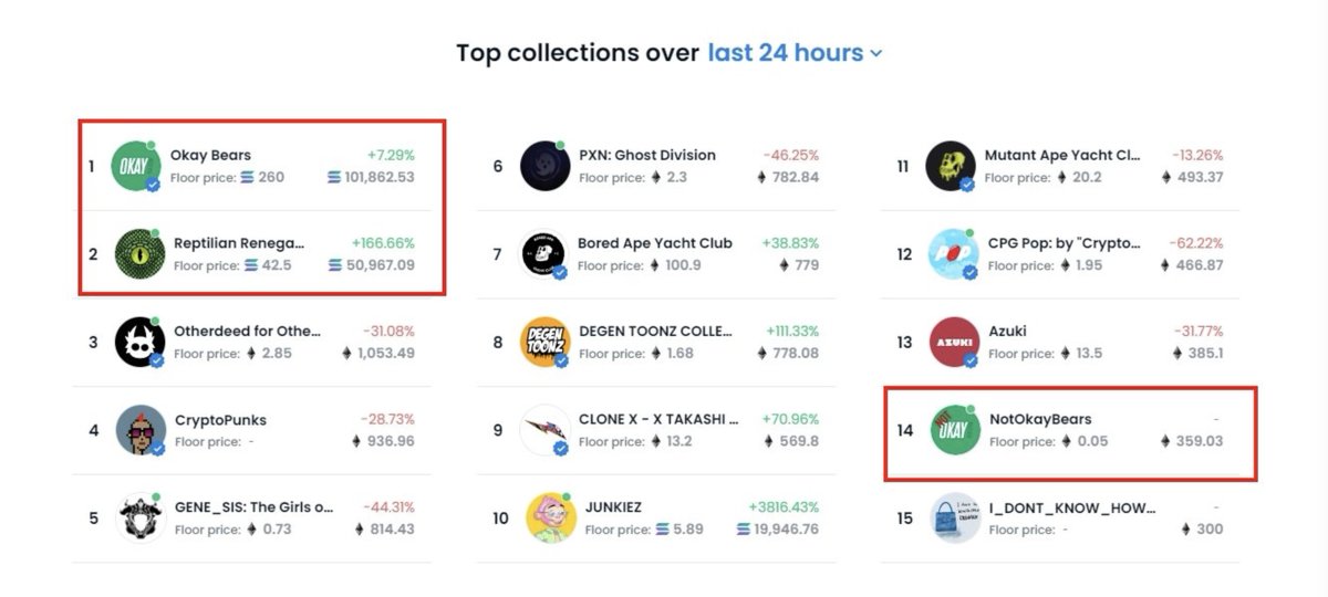 @egsnft@MagicEden 17/ Okay Bears 🐻 & Reptilian Renegade 🦎 topped the OpenSea 24h Volume over big names in ETH. In fact, OKB topped it for 2 straight days upon mint. With the help of a bunch of key individuals in the NFT space, OKB gained serious traction & interest from ETH maxis.