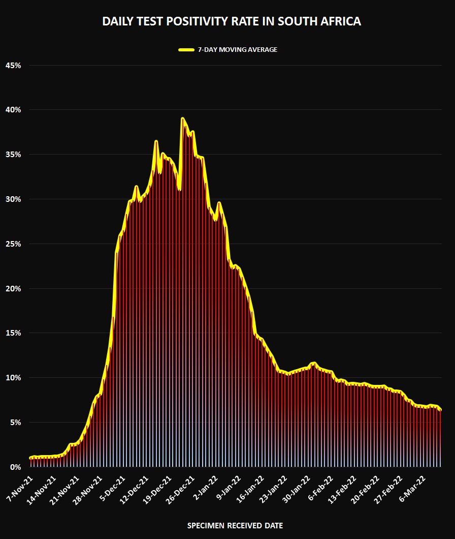 COVID-19 cases continue to decline in South Africa. Current 7-day moving average is slightly above the levels seen during the interwave periods