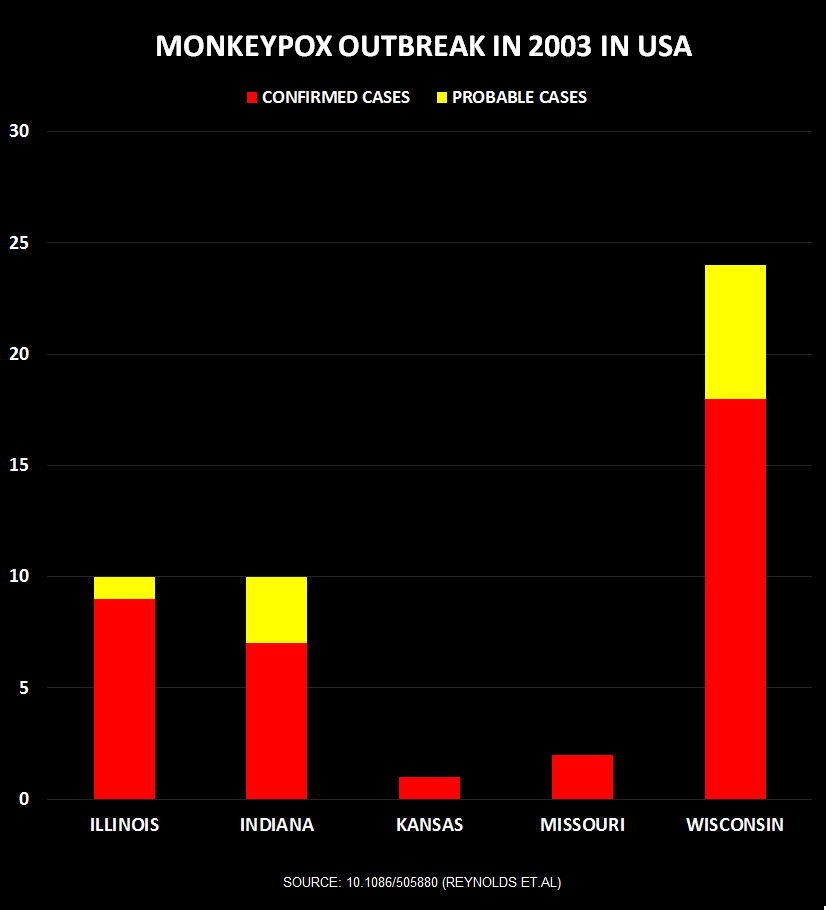 The United States reported a multistate outbreak in 2003, when a shipment of small mammals (rope squirrels, tree squirrels, African giant pouched rats, brush-tailed porcupines, dormice, and striped mice) from Ghana spread the virus to pet prairie dogs.