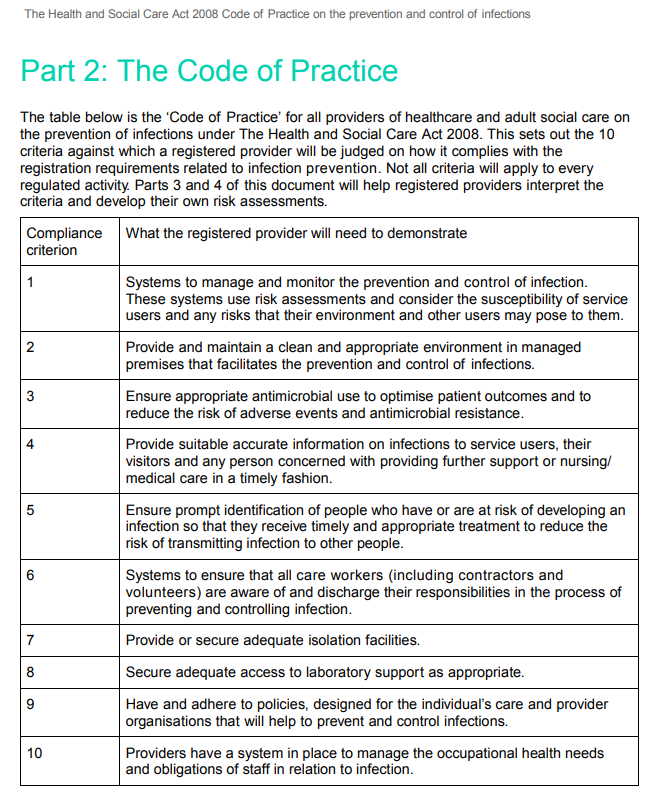 '9. Have & adhere to policies, designed for the individual’s care & provider organisations that will help to prevent & control infections.'