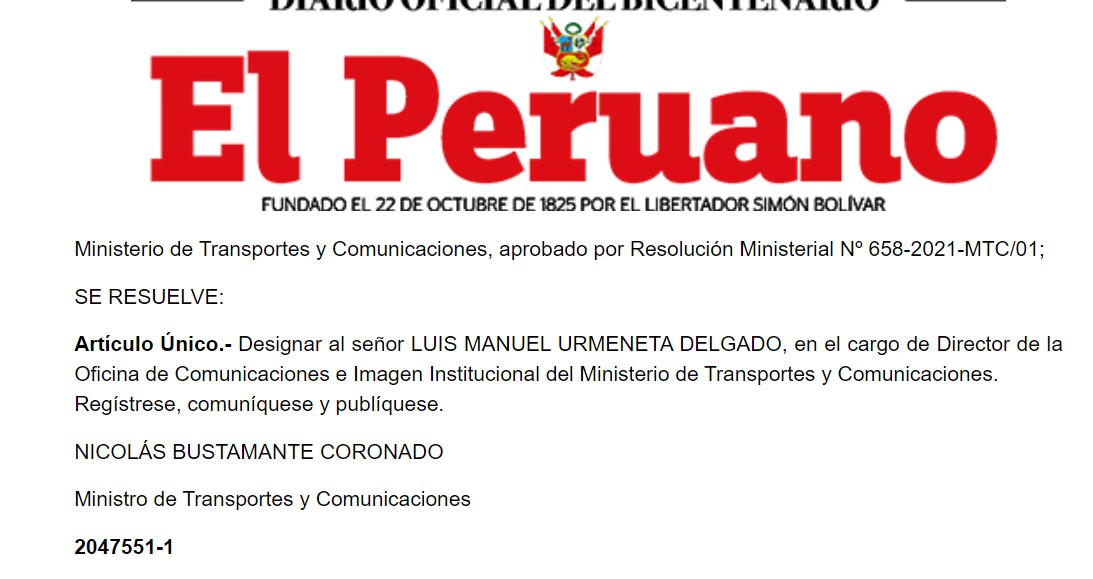 el viernes 11 de marzo, mientras estabas con las ansias de juerguear el fin de semana, salió una resolución en el @MTC_GobPeru con la designación de su nuevo Director de Comunicaciones e Imagen Institucional, Luis Urmeneta Delgado.