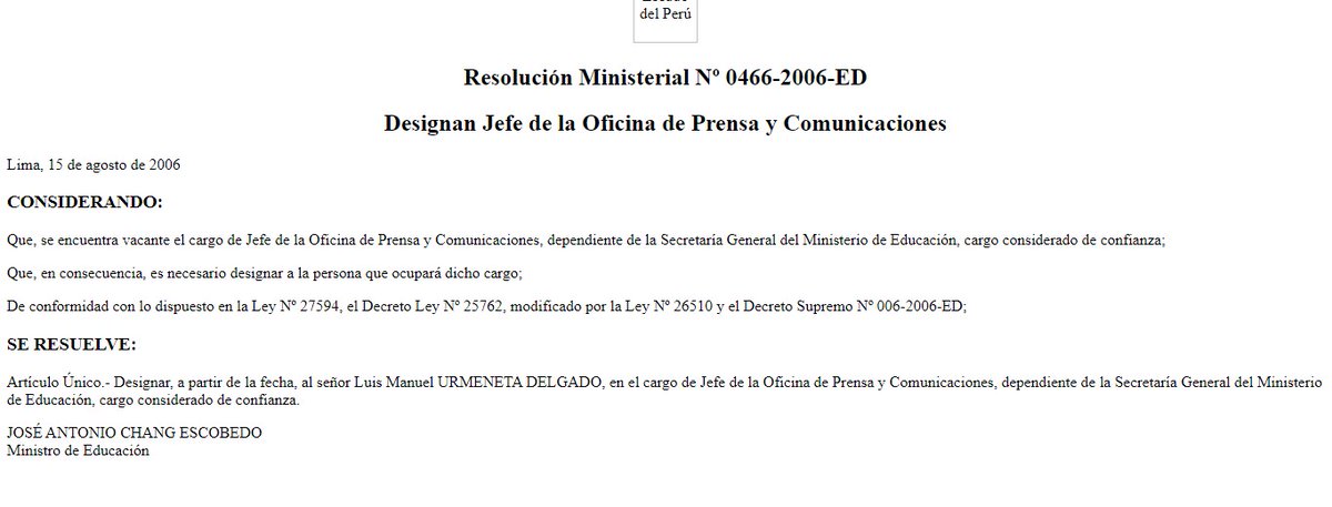 ¿pero quién es Luis Urmeneta Delgado? Para muestra una resolución del 15 de agosto del 2006. Apenas Antonio Chang, el pataza y socio de Alan García, asumió como ministro de Educación, llamó a Urmeneta como su jefe de Comunicaciones.