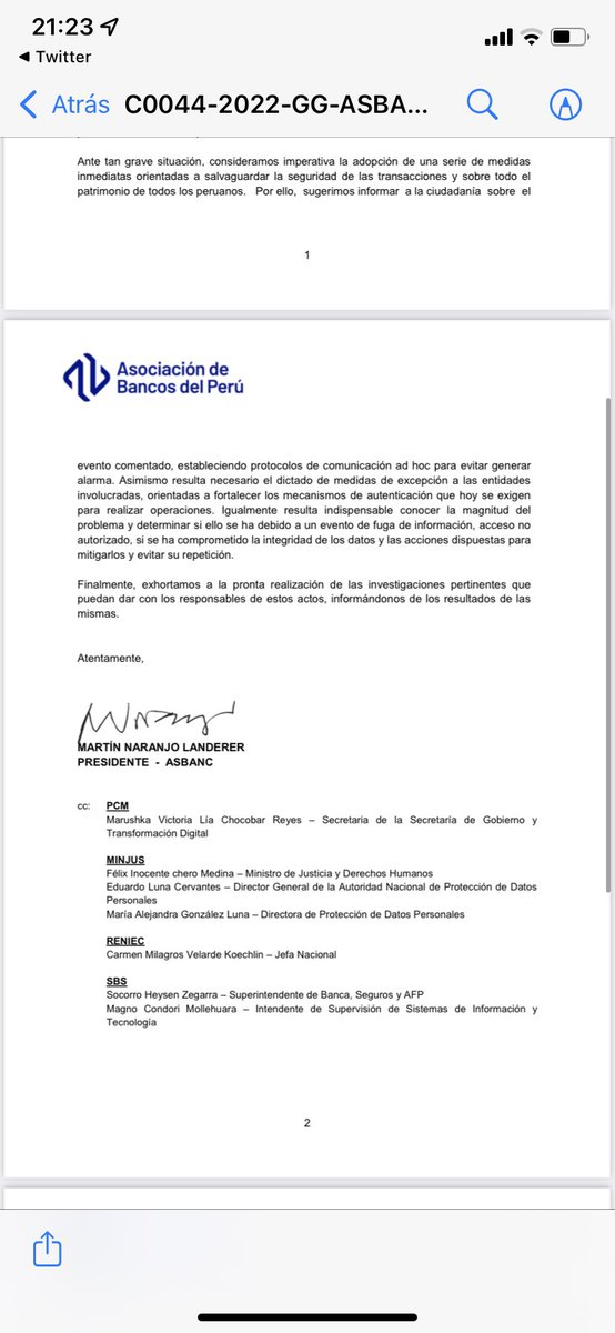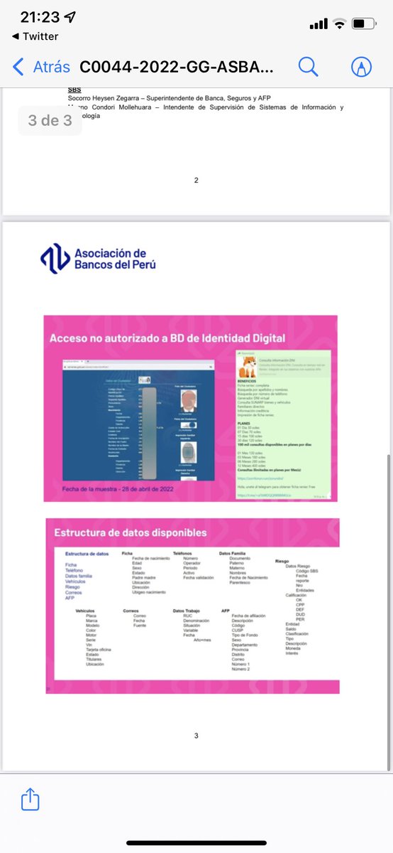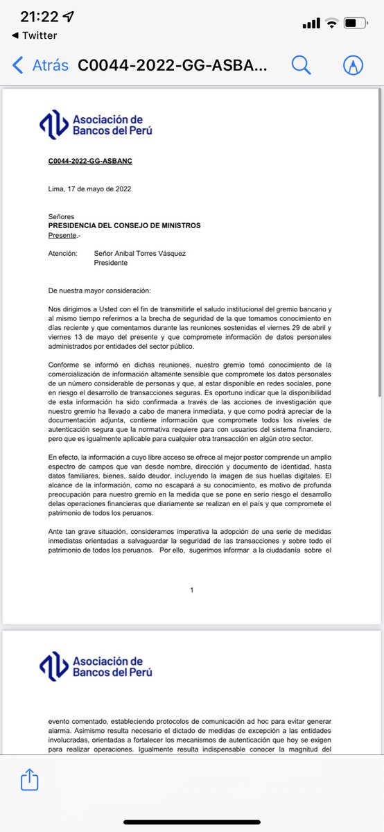 #URGENTE la asociación de Bancos @asbancperu ha enviado una carta a la PCM de @anibaltorresv advirtiendo sobre una filtración de datos personales de ciudadanos peruanos (dni familiares directos teléfono, bienes en Sunarp y correos) que se venden al mejor postor (SIGAN EL HILO)