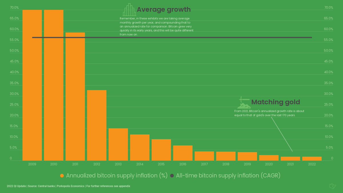 47/ And now Bitcoin. Bitcoin is a different beast from any prior type of money. Though the supply of bitcoins grew rather quickly in the early years, from 2021 it is growing about as fast as gold on an annualized rate. At the next halving it will be that much slower.
