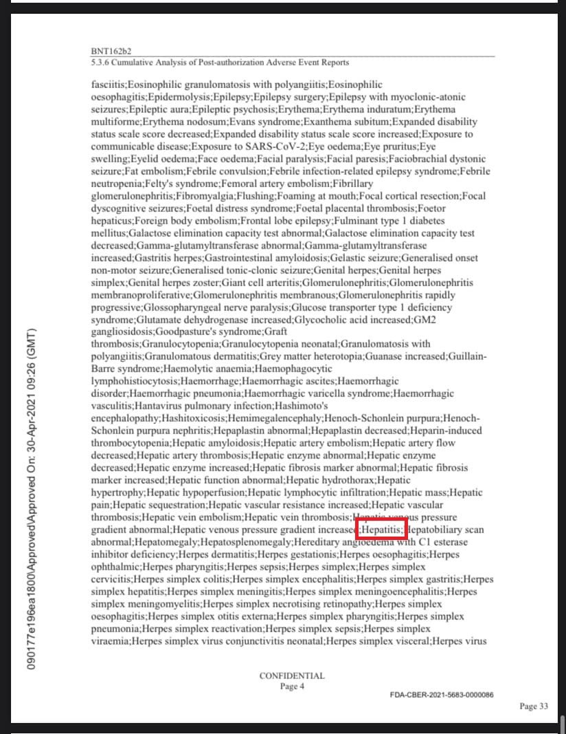 1300 efectos secundarios aparecen en los informes sobre seguridad que un juez de EEUU obligó a publicar a la FDA (si no hubiéramos tardado 75 años), aparece la hepatitis, pero los voceros mediáticos parece que tienen claro que la hepatitis no es por 💉 así sumarísimamente...