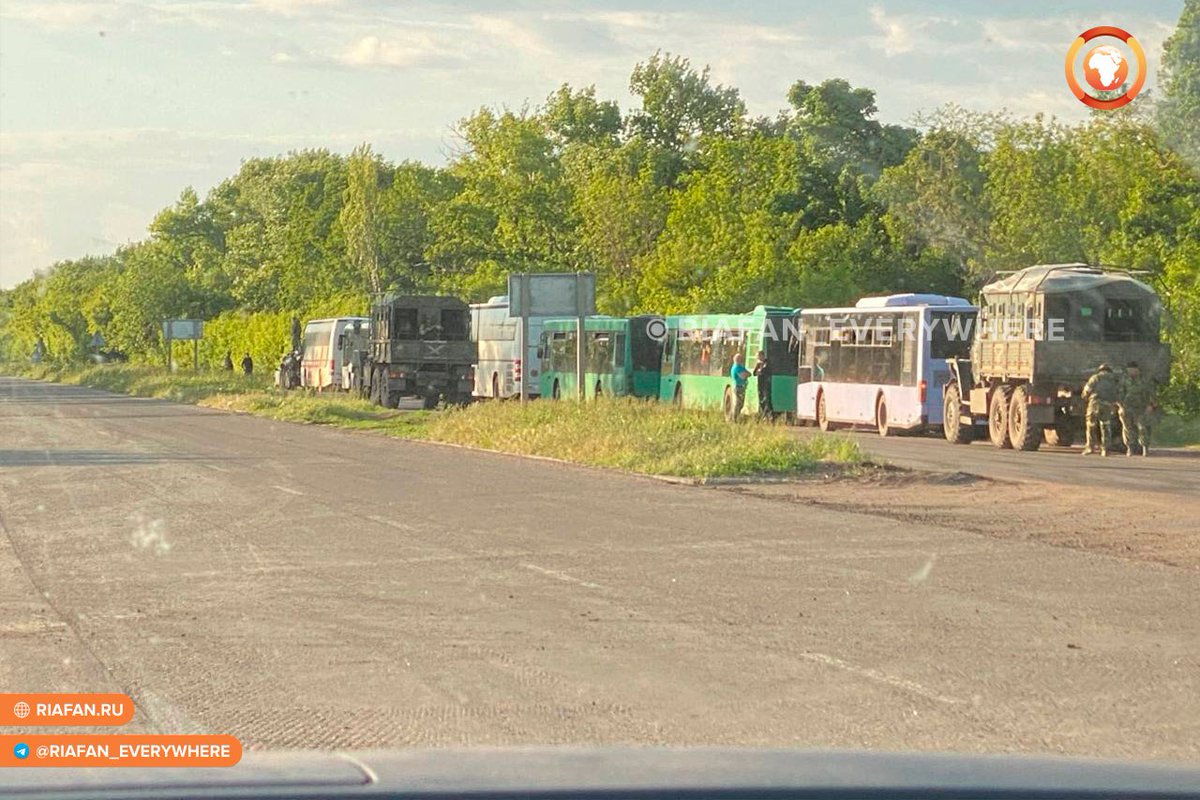 Aqui la foto de los autobuses que han salido hoy de Azovstal con la captura de los ultimos nazis de Azov que se escondian alli, oficialmente son 2439 ucronazis capturados en 3 dias.