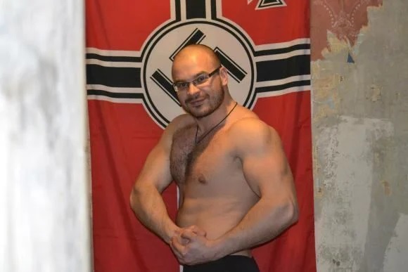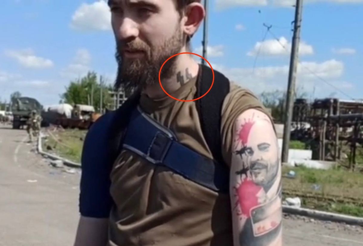 Un luchador por la "democracia" europea capturado hoy en Azovstal, enseña sus tatuajes fascistas, entre ellos una esvastica junto al simbolo de una llave que simboliza a la Leibstandarte SS, una formación de élite de las Waffen-SS que hacia de guardia personal de Adolf Hitler.