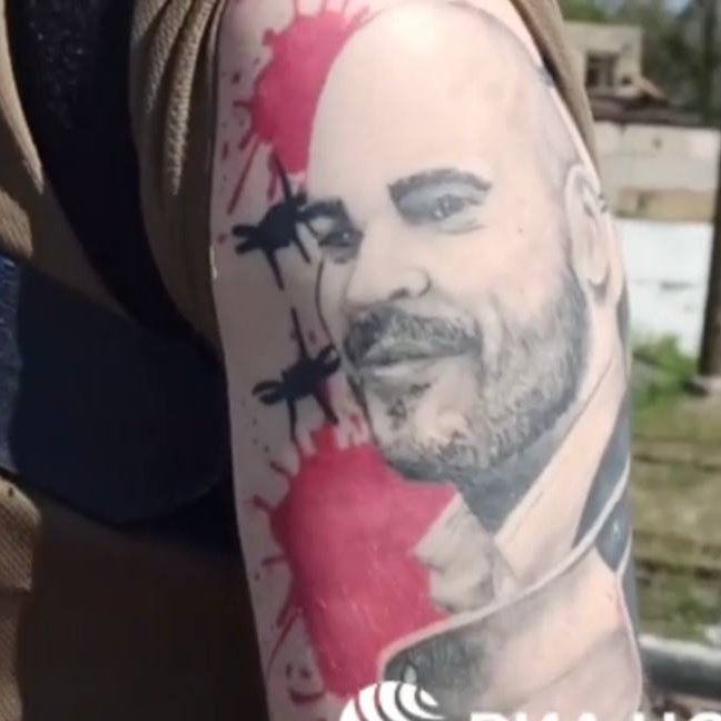 El tatuaje que tiene el ucronazi en el brazo, es el retrato del nazi ruso Maxim Sergeyevich Martsinkevich, conocido como "Tesak", que apareció acuchillado en el cuello en una cárcel de Rusia en el año 2020.