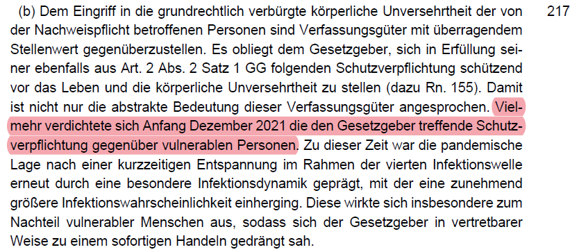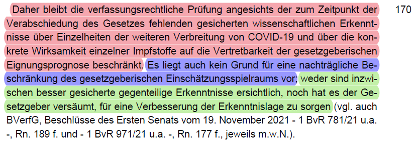 /21 Es bezieht sich zuerst auf den Zeitpunkt der Verabschiedung der Impfpflicht. Es bestand große Einigkeit in der Fachcommunity zu der Schutzwirkung inkl. Fremdschutz (Rn. 173). Auch durfte trotz der neu auftretenden Omikron-Variante, der Gesetzgeber handeln (Rn. 174).