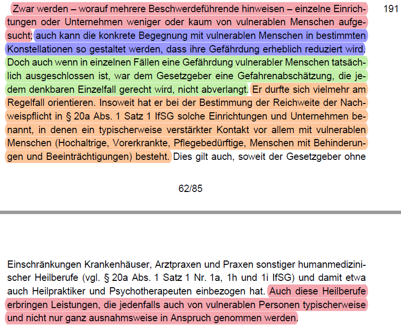 /32 Was aber kritischer zu sehen ist, ist die Auffassung des BVerfG zur Typisierung von Regelungen (Rn. 190 - 191). Danach durfte der Gesetzgeber unabhängig von potentiellen Gefährdungen vulnerabler Menschen pauschal bestimmte Gruppen mit der Impfpflicht belasten (Rn. 191).