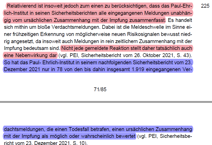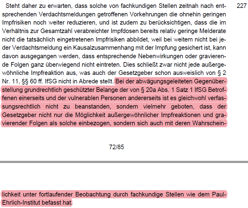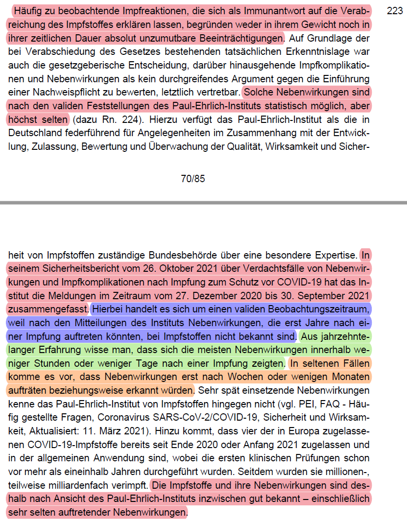 /56 Das BVerfG befasst sich dann in Detail mit möglichen Risiken und den Meldungen ans PEI (Rn. 223 - 227). Es räumt zuerst mit dem Mythos auf, dass Nebenwirkungen auch Jahre später auftreten können (Rn. 223). Es führt ein bisschen Statistik zu Impfnebenwirkungen aus (Rn, 224).
