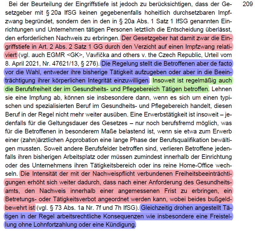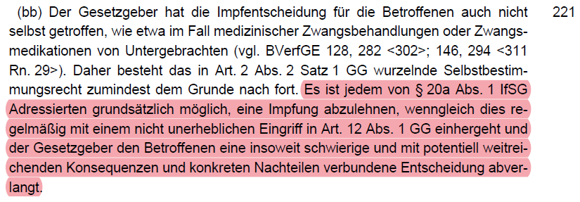 /39 Allerdings hält das BVerfG dem Gesetzgeber zugute, dass er keinen Zwang anwendet. Dadurch haben die Betroffenen noch die Wahl zwischen Impfung oder einen möglichen Verzicht auf ihren Job. Die Intensität des Eingriffs erhöht sich auch durch die Nachweispflicht (Rn. 209).