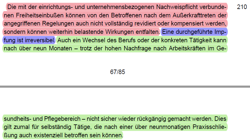 /46 Denn das ändert für die Betroffen nichts an der Tatsache, dass diese die Nachweise erbringen müssen. Dann Verweist das BVerfG auf das Gewicht der Gemeinwohlbelange, konkret den erforderlichen Schutz vulnerabler Menschen (Rn. 217 - 218).