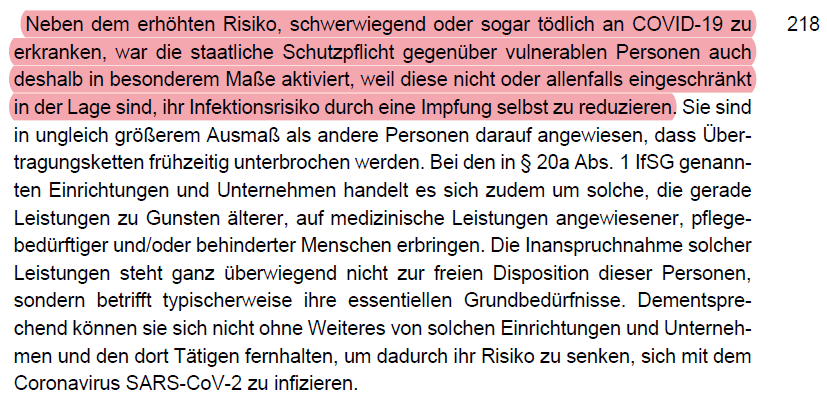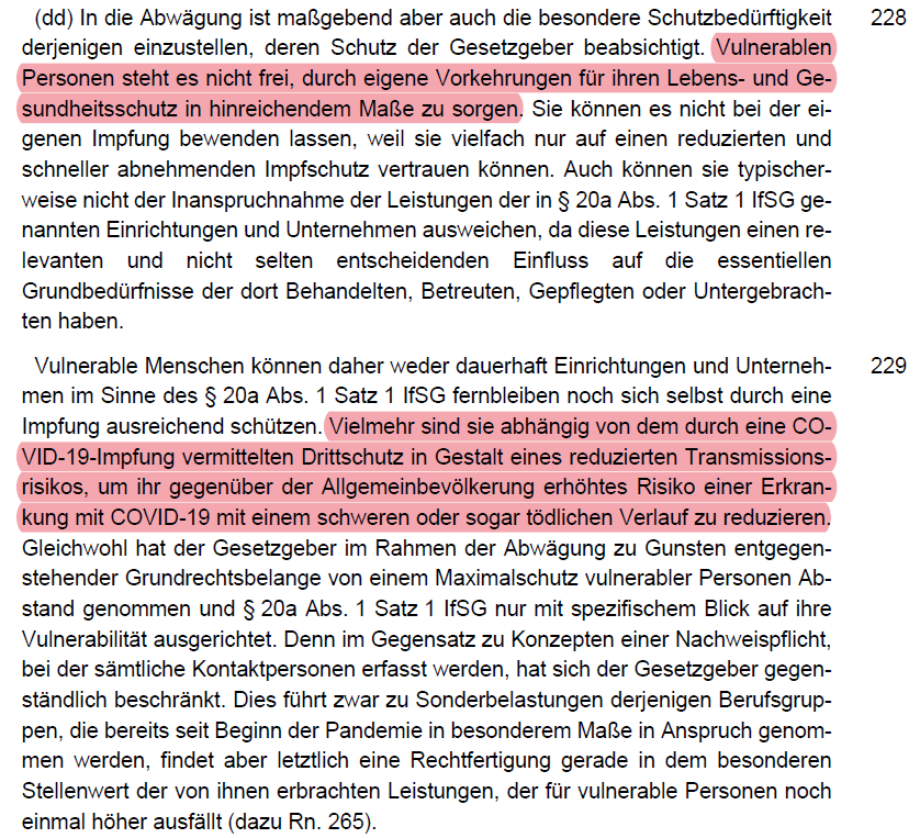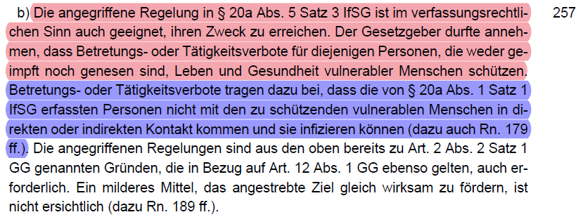 /36 Etwas kurios war der Einwand, vulnerable Menschen könnten sich im Falle einer Infektion behandeln lassen, dass lehnte das BVerfG als gleichgeeignetes Mittel verständlicherweise ab (Rn. 198). Auch war es egal ob diese selbst geimpft waren (Rn. 199).