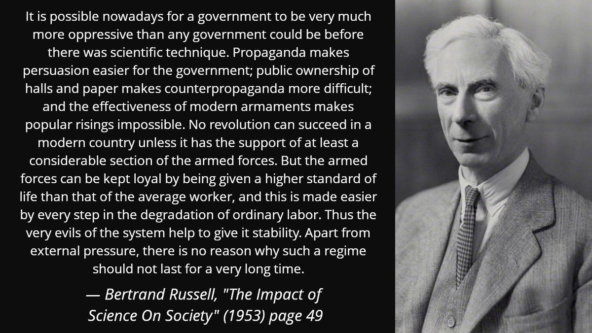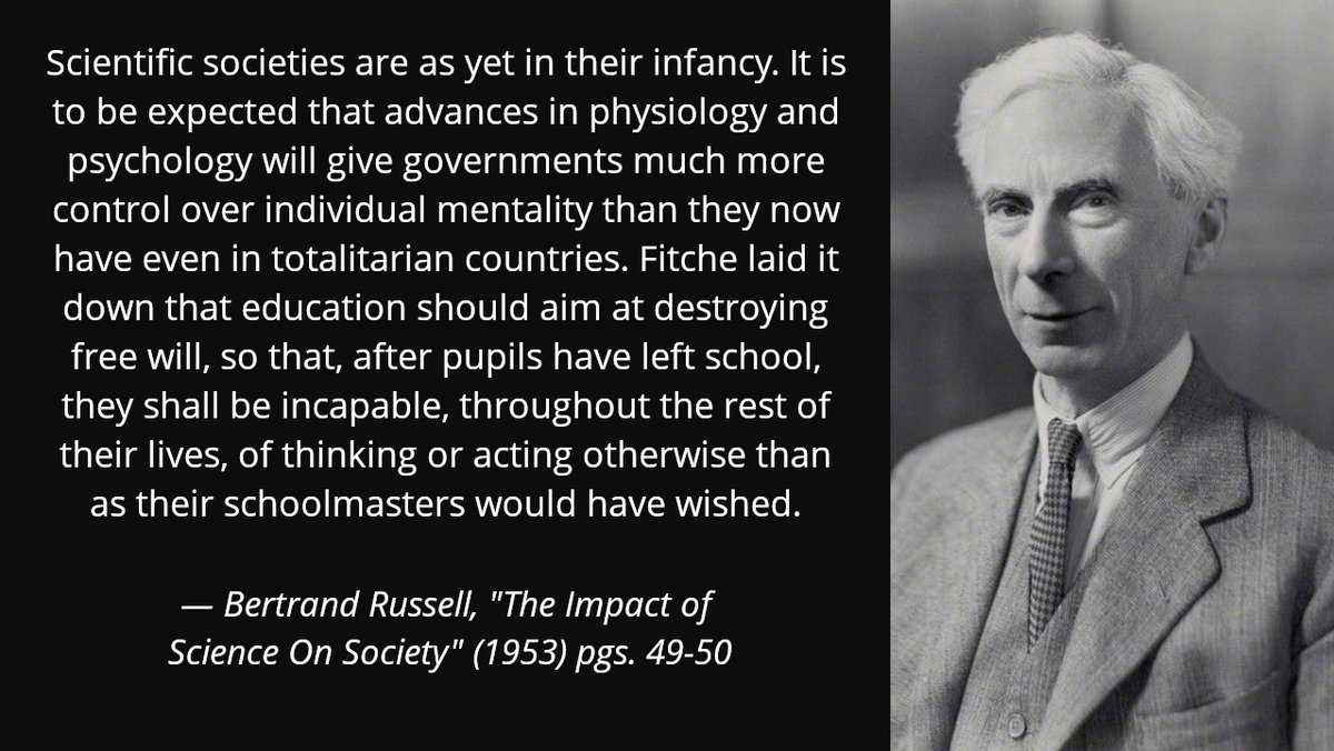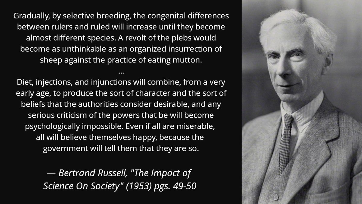 1/ Today a few quotes by Bertrand Russel from his book: "The Impact of Science On Society (1953). Do you think this is where we are going? Is that the kind of future The Party has in mind? Or some of these things have already been implemented without the public knowing?