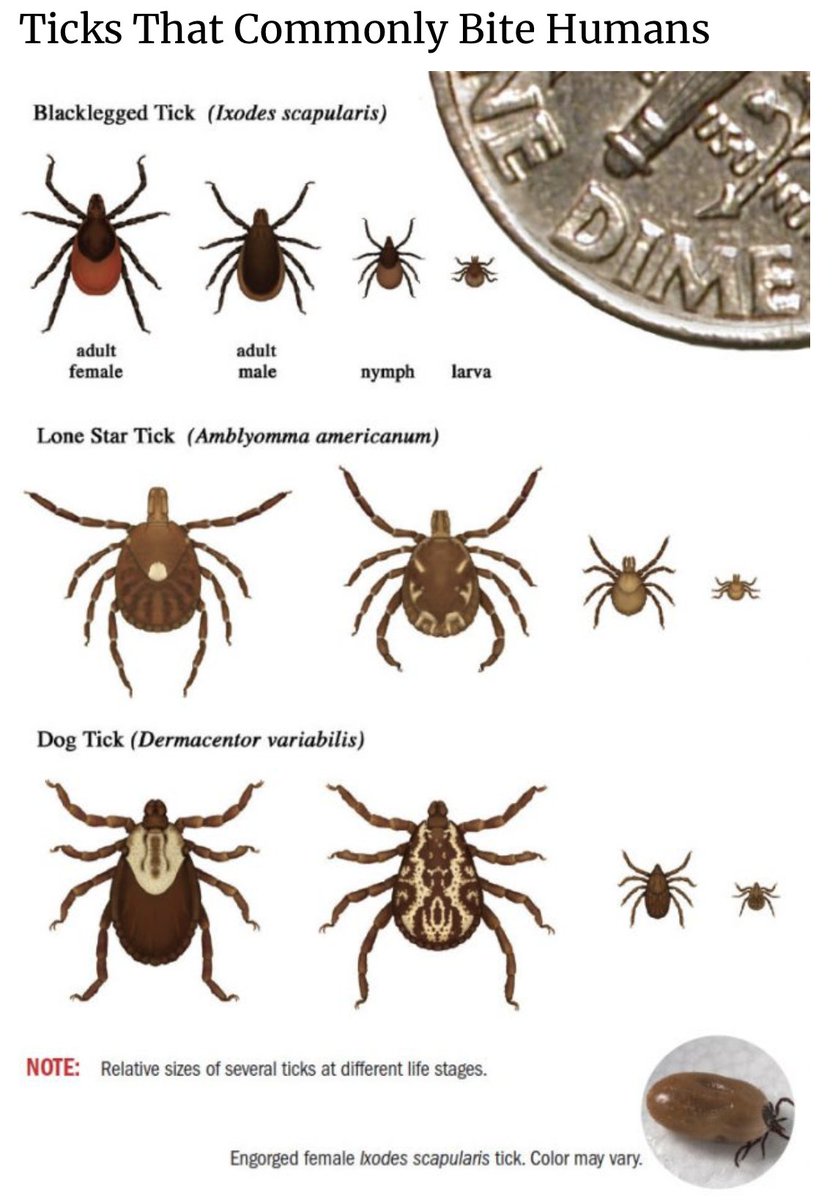 🪲 Many species - in US, primarily Rocky Mountain wood tick & American dog tick
