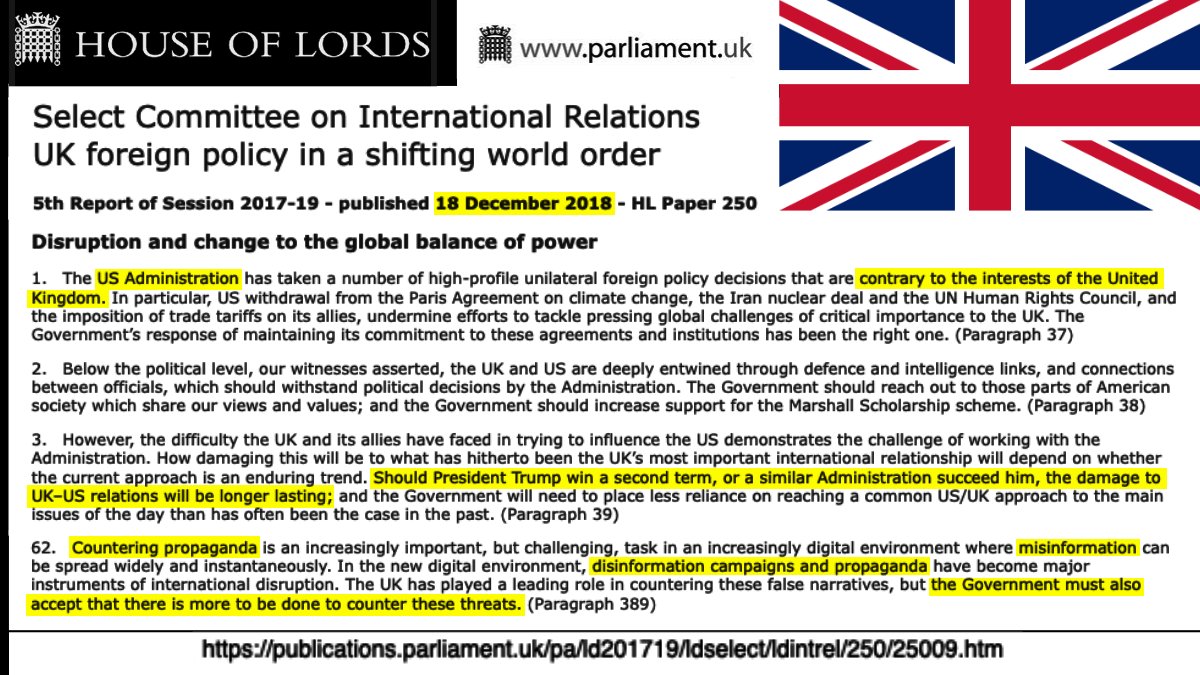 A 12/18/18 report by the British House of Lords explains that Trump's America First policy was seen as "contrary to the interests of the United Kingdom."