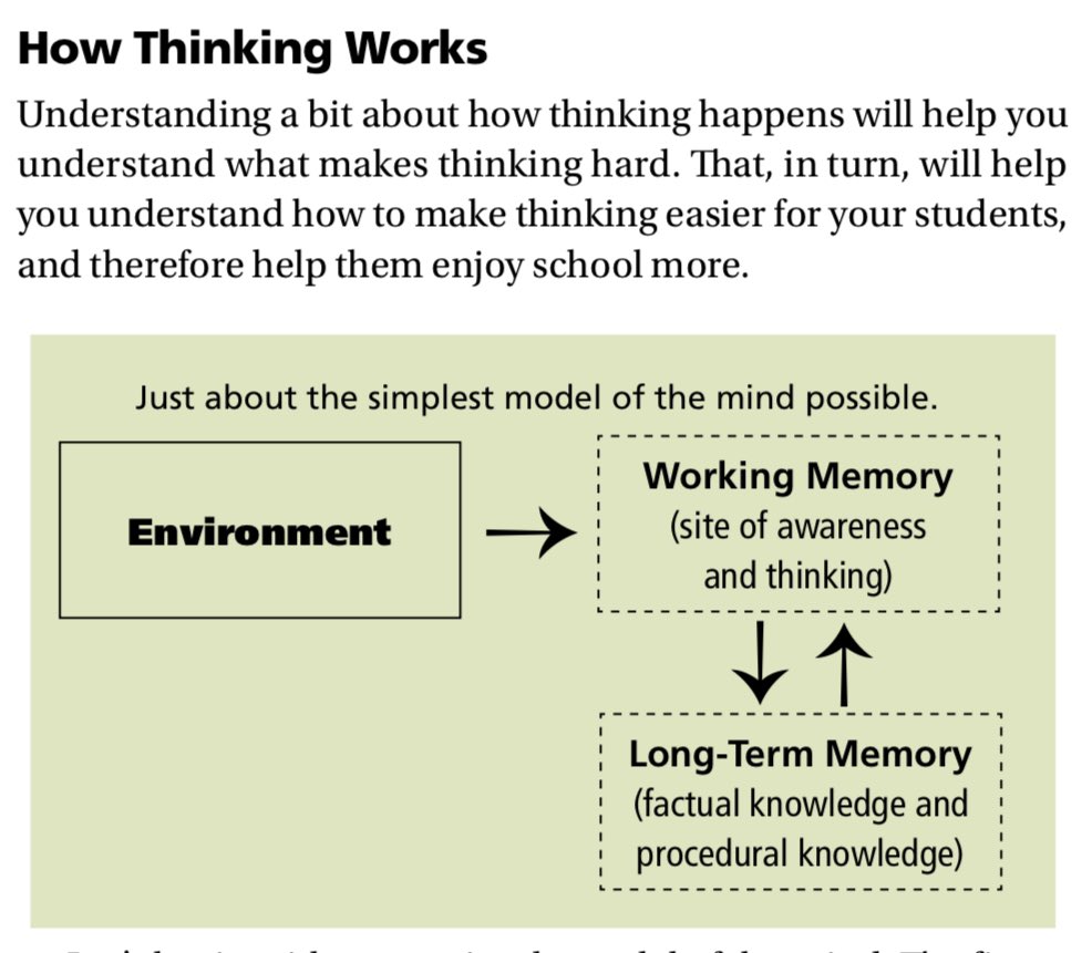 🧠 WM has limited space & thinking becomes increasingly difficult as it gets crowded. ‘Unless the cognitive conditions are right, we avoid thinking.’ Teachers should promote challenging cognitive work by reviewing each lesson in terms of what students will THINK about.