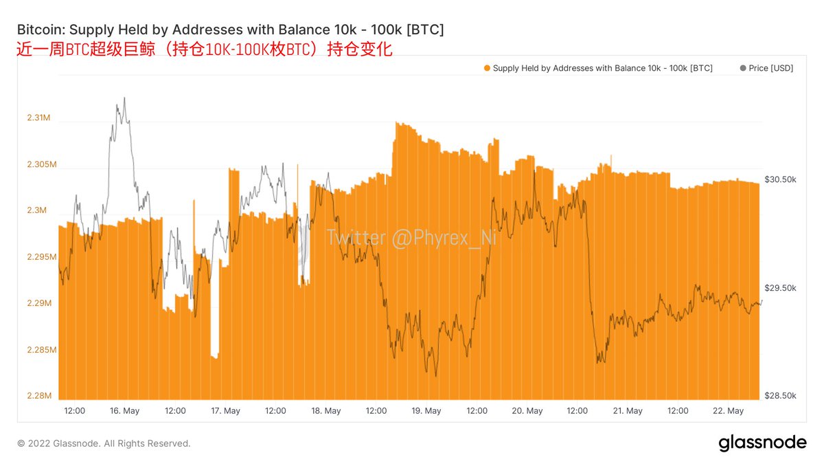 超级巨鲸(持仓10K-100K枚BTC)近24小时没有太大的变化,但超级巨鲸中包括有头部交易所的地址