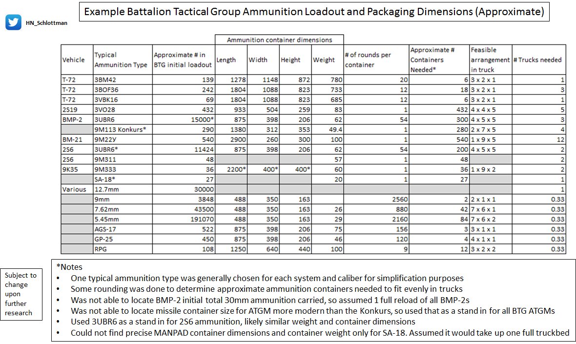 1/ Made a more refined take on BTG logistical requirements, now taking into account fuel and ammunition packaging size. If spaced out daily, it still came to about ~14 truckloads + ~3 7,500 L tanker trucks (deleted the 1st thread because Twitter didn't like PowerPoint)