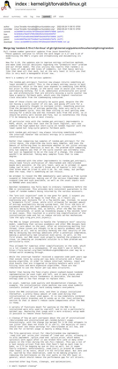 Linux 5.19 will have more exciting random number generator evolution. I just submitted this pull to Linus: lkml.org/lkml/2022/5/22… which notes that random.c now clocks in at 931 lines of code and 466 lines of comments. 1/9
