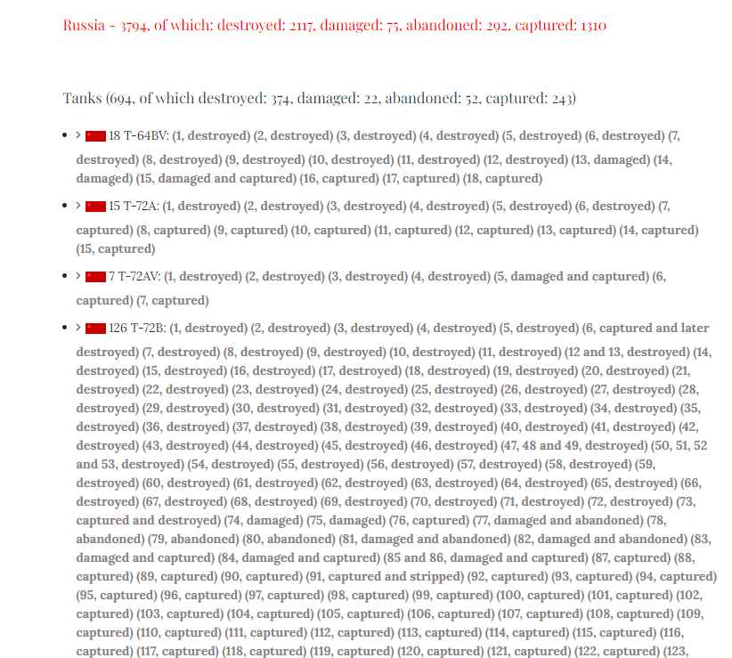 Los 30 BTGs perdidos, debieran reflejar 300 tanques y 600 de cada clase de vehículos de infantería. Pero las bajas verificadas en oryxspioenkop.com indican que Rusia perdido 694 tanques, equivalentes a por lo menos 69 BTGs. Al parecer, el daño es mas extenso del admitido