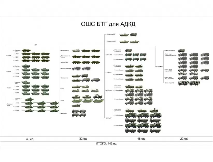 Cada BTG cuenta con diez tanques, 20 vehículos blindados de transporte de infantería, otros 20 blindados de combate y un grupo de vehículos de apoyo. Es algo así como la célula básica del ejército ruso. Entendido eso, sigamos con el recuento