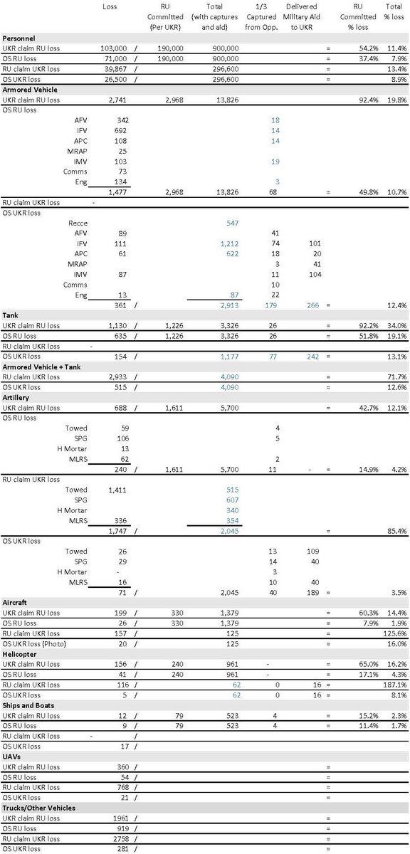 OSINT % losses of Russian Committed (Russian total) vs Ukrainian total