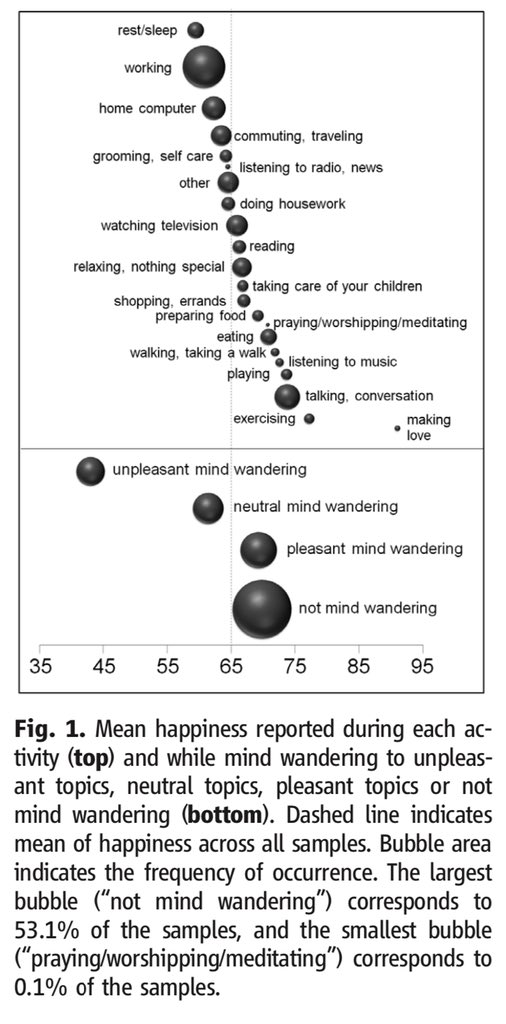 This paper finds folks are less happy when they let their mind wander: “a human mind is a wandering mind, and a wandering mind is an unhappy mind. The ability to think about what is not happening is a cognitive achievement that comes at an emotional cost.” renevanmaarsseveen.nl/wp-content/upl…