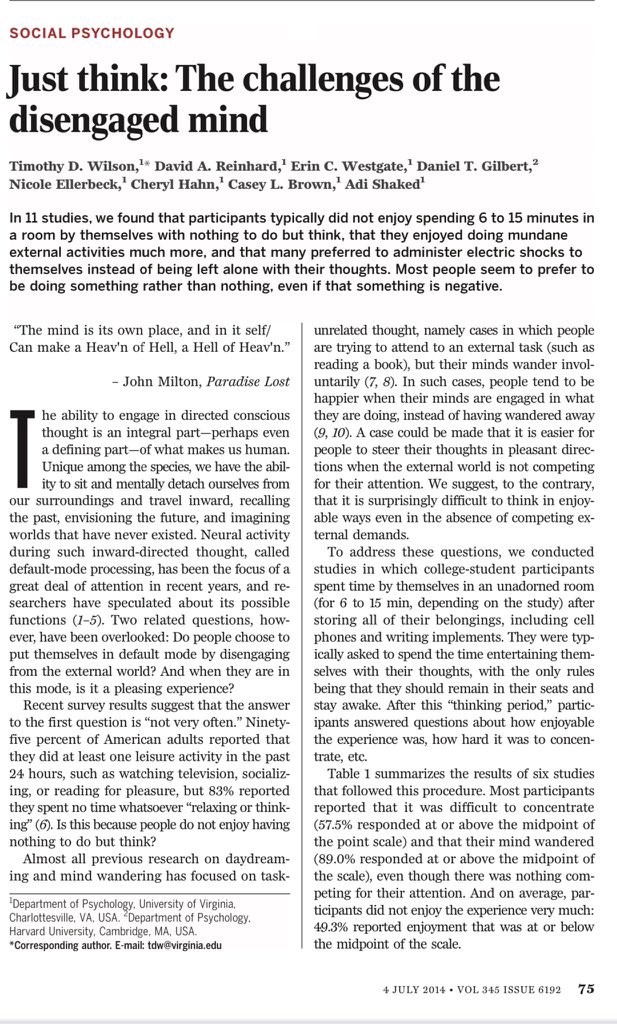 “In 11 studies, we found that participants typically did not enjoy spending 6 to 15 minutes in a room by themselves with nothing to do but think… many preferred to administer electric shocks to themselves instead of being left alone with their thoughts.” wjh-www.harvard.edu/~dtg/WILSON%20…