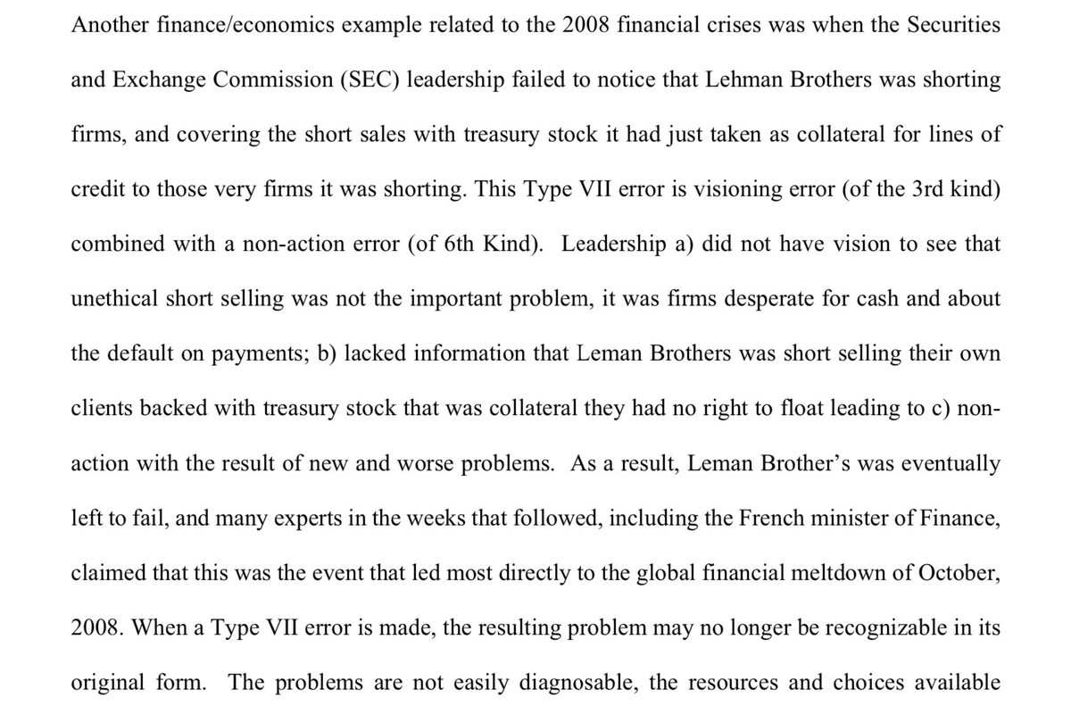 Type VII Errors are worst. They happen when interactions between other errors lead to a failure cascade, turning the original normal problems into “wicked problems” that have complex & overlapping causes without simple solutions. Think the Iraq War & Subprime Mortgage Crisis. 8/9