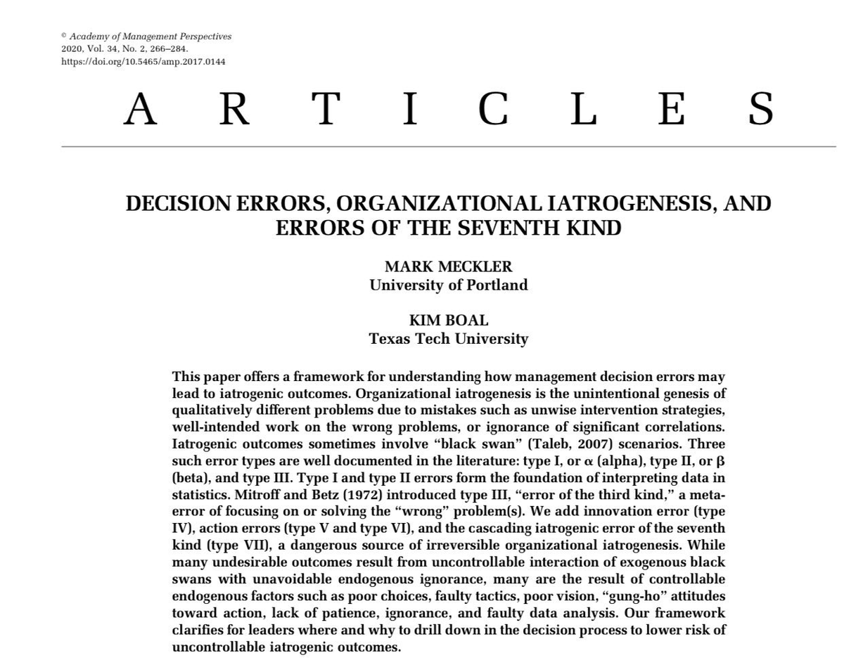 This paper outlines 7 classes of errors that destroy strategic decisions, ending with the epic-sounding Type VII Iatrogensis Cascade.