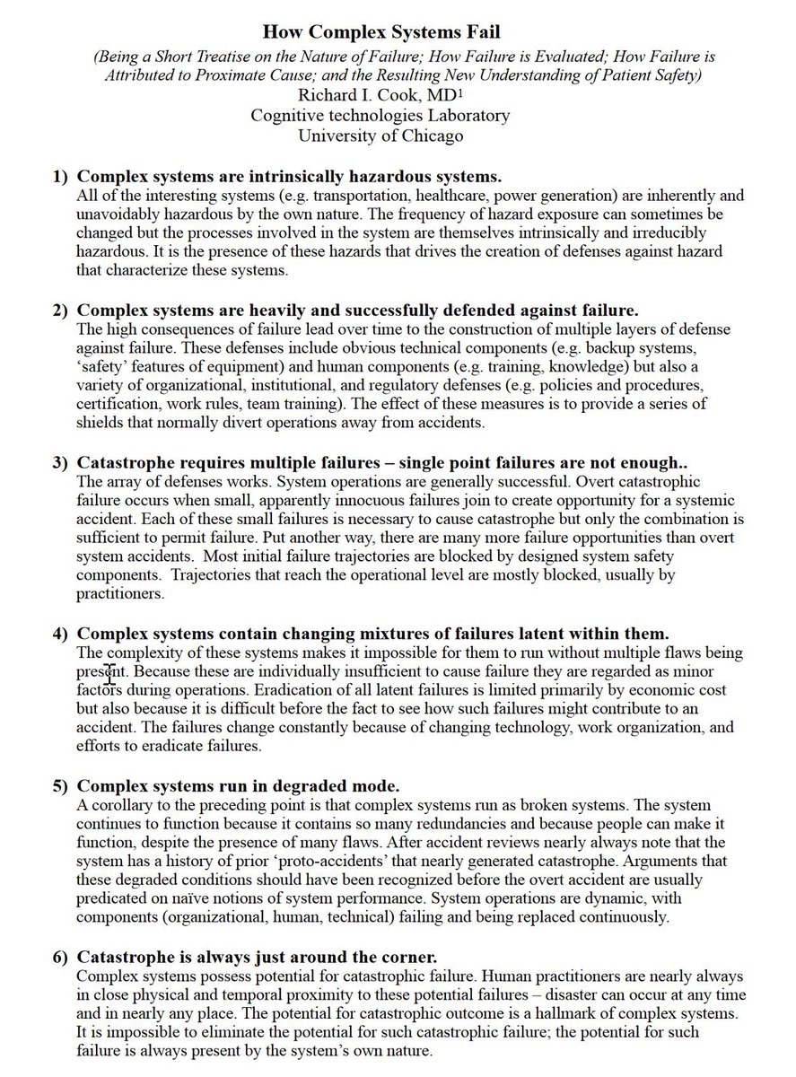 Cascades happen in complex systems, thus “all of the interesting systems (e.g. transportation, healthcare, power generation) are inherently and unavoidably hazardous.”