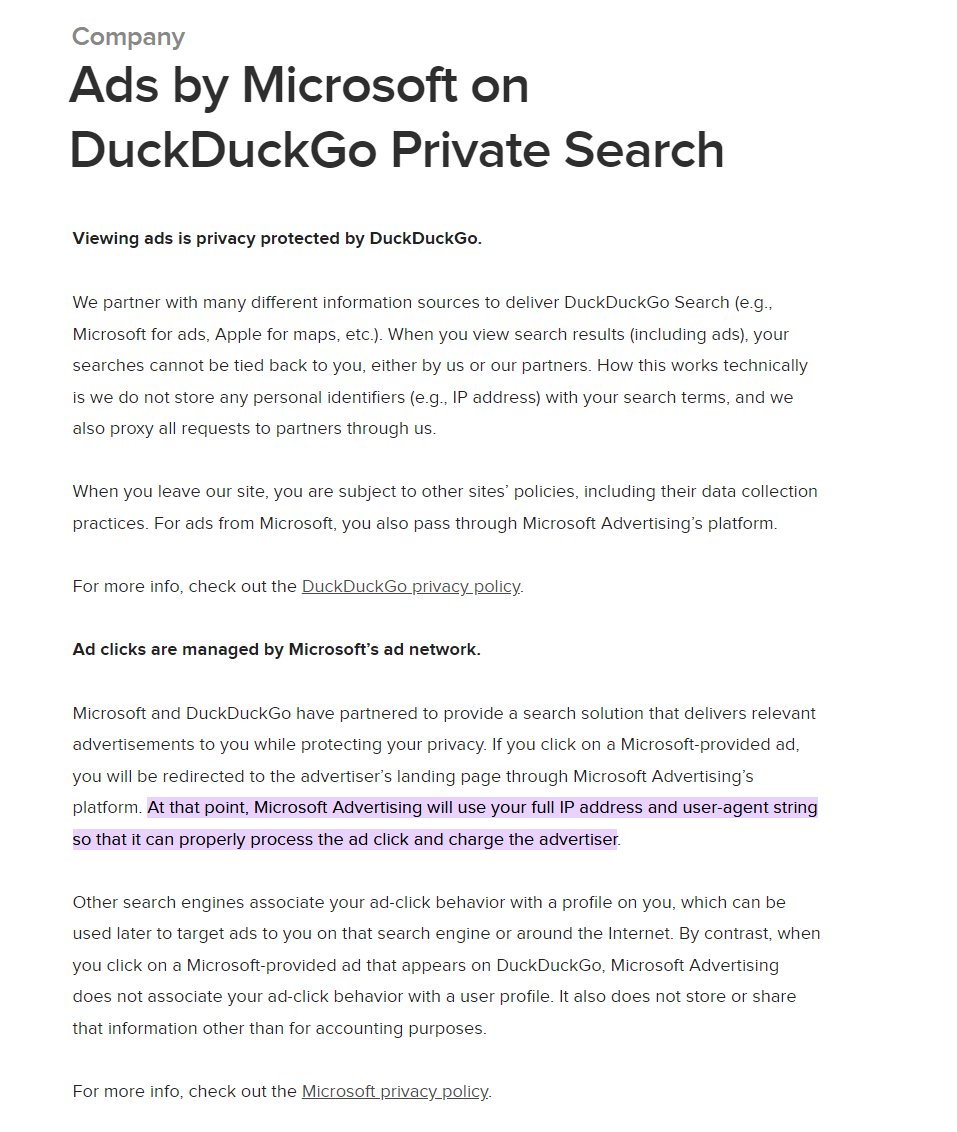It's public knowledge that DuckDuckGo has been creating exemptions for Microsoft for awhile, which they've been required to explain on a page like @ help.duckduckgo.com/duckduckgo-hel… / DDG openly says they are sending your user IP address & user agent to Microsoft for the DDG ads on-click.