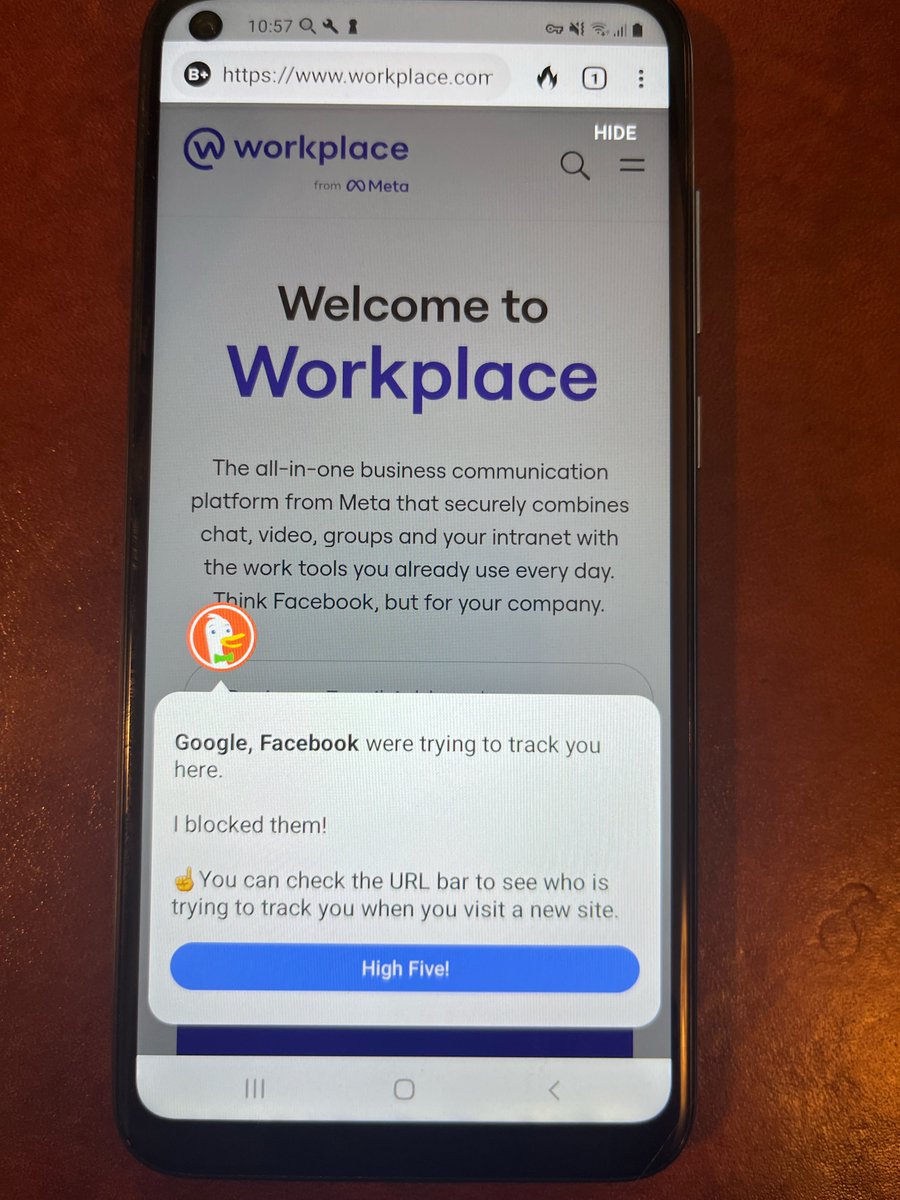 I tested the DuckDuckGo so-called private browser for both iOS and Android, yet *neither version* blocked data transfers to Microsoft's Linkedin + Bing ads while viewing Facebook's workplace[.]com homepage.